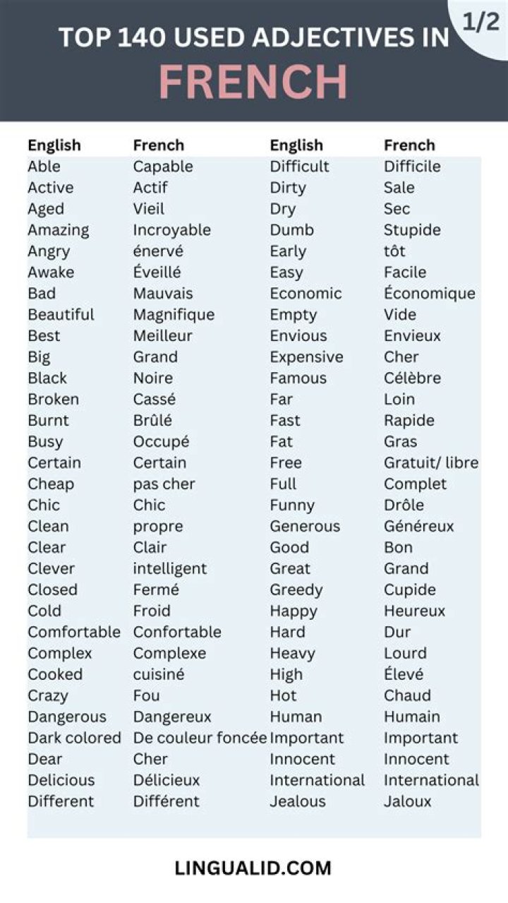 Most French adjectives go after the noun they describe. Some very common adjectives usually come before the noun: bon/mauvais, court/long, grand/petit, jeune/nouveau/vieux, gros, haut, beau, joli, premier, meilleur.